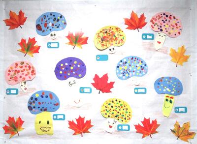 年長クラス …色とりどりの”かさ”をかぶった楽しいお顔の『きのこ』さんたちです^^